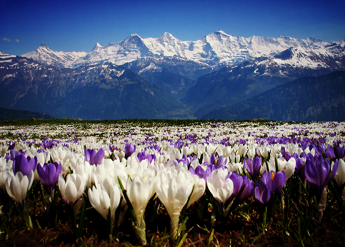 Hoch über dem Thunersee mit Blick auf Eiger, Mönch und Jungfrau liegt eine der beliebtesten Wanderrouten der Schweiz. Die 9,3 Kilometer lange Panorama-Wanderung vom Niederhorn nach Beatenberg überzeugt vor allem durch ihre phänomenale Aussicht. Im Frühling können die Krokusse in Blumenmeeren bestaunt werden. Man kann sich kaum satt sehen an der majestätischen Gebirgskette von Eiger, Mönch und Jungfrau, die zum Greifen nah scheint.
